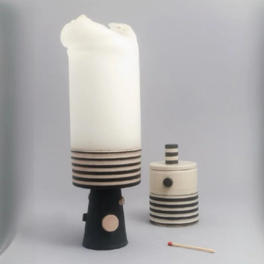 I craft every stand through a combination of wheel-throwing and hand-building techniques, allowing me to explore different textures and forms. My process includes various surface treatments: water-etching that creates subtle patterns and depth, colored clay inlays that add unexpected pops of color, and an array of glazes from crystalline to metallic that transform in the kiln. These technical choices aren't just aesthetic decisions - they're part of each piece's story and functionality.
