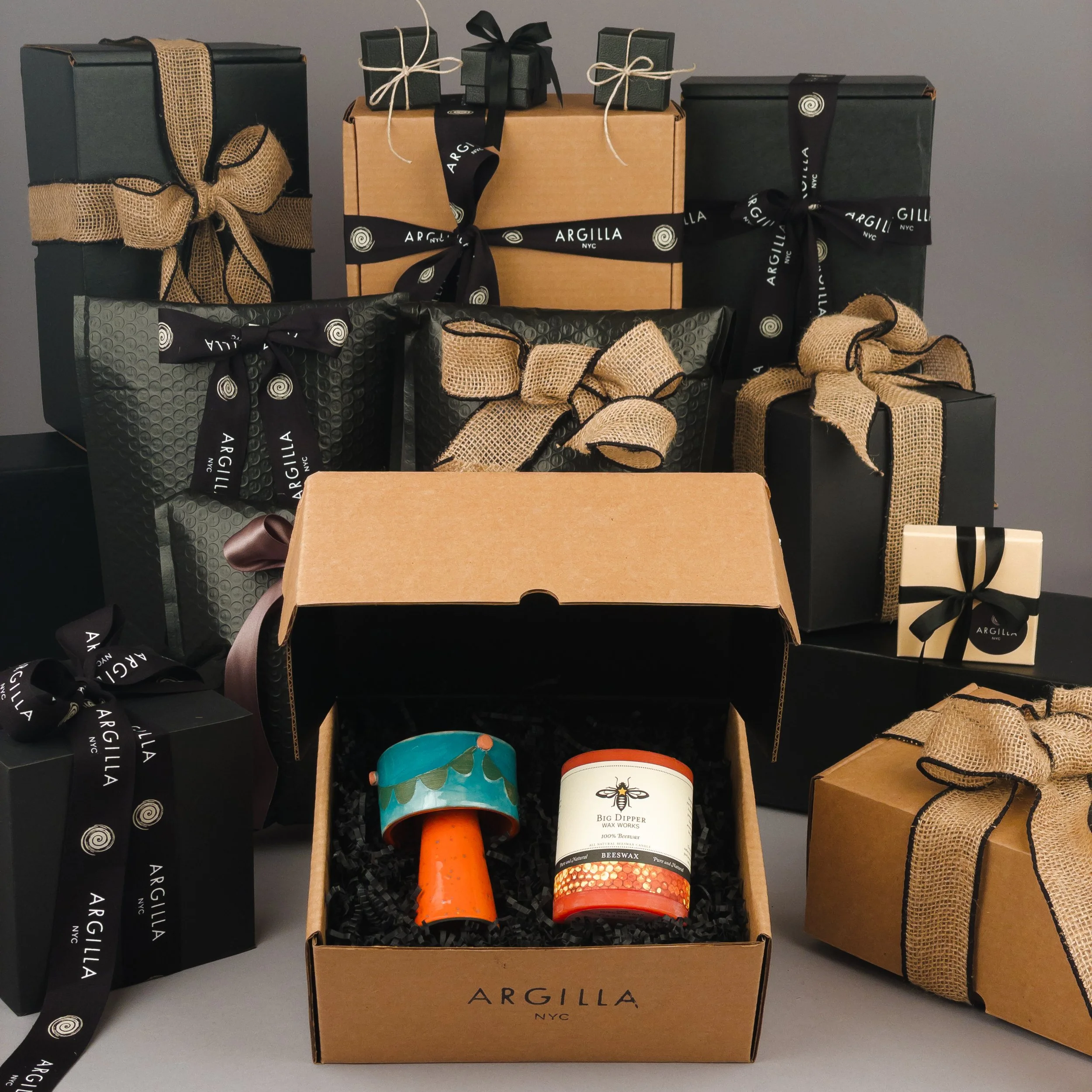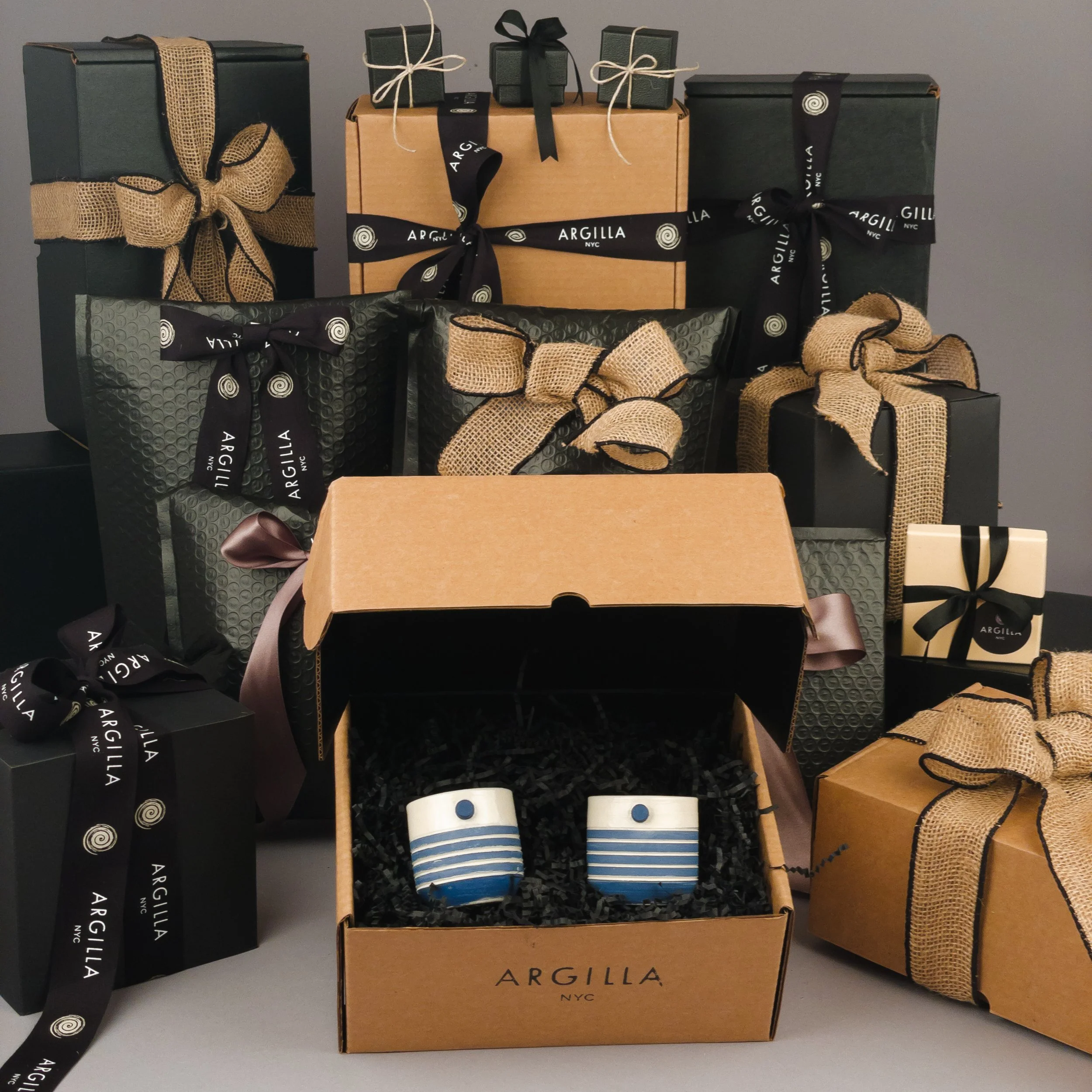 The packaging carries the same attention as the pieces: bi-color mailers in black and kraft tones, filled with black crinkle paper, and tied with Argilla-branded ribbon or burlap bows. As the idea grew, I began offering smaller black square boxes for individual pieces—match strikers, pitchers, or stands—and even black bubble mailers for lighter gifts like single espresso cups, matcha bowls, or porcelain jewelry. Now, every Argilla piece leaves the studio ready to be given.