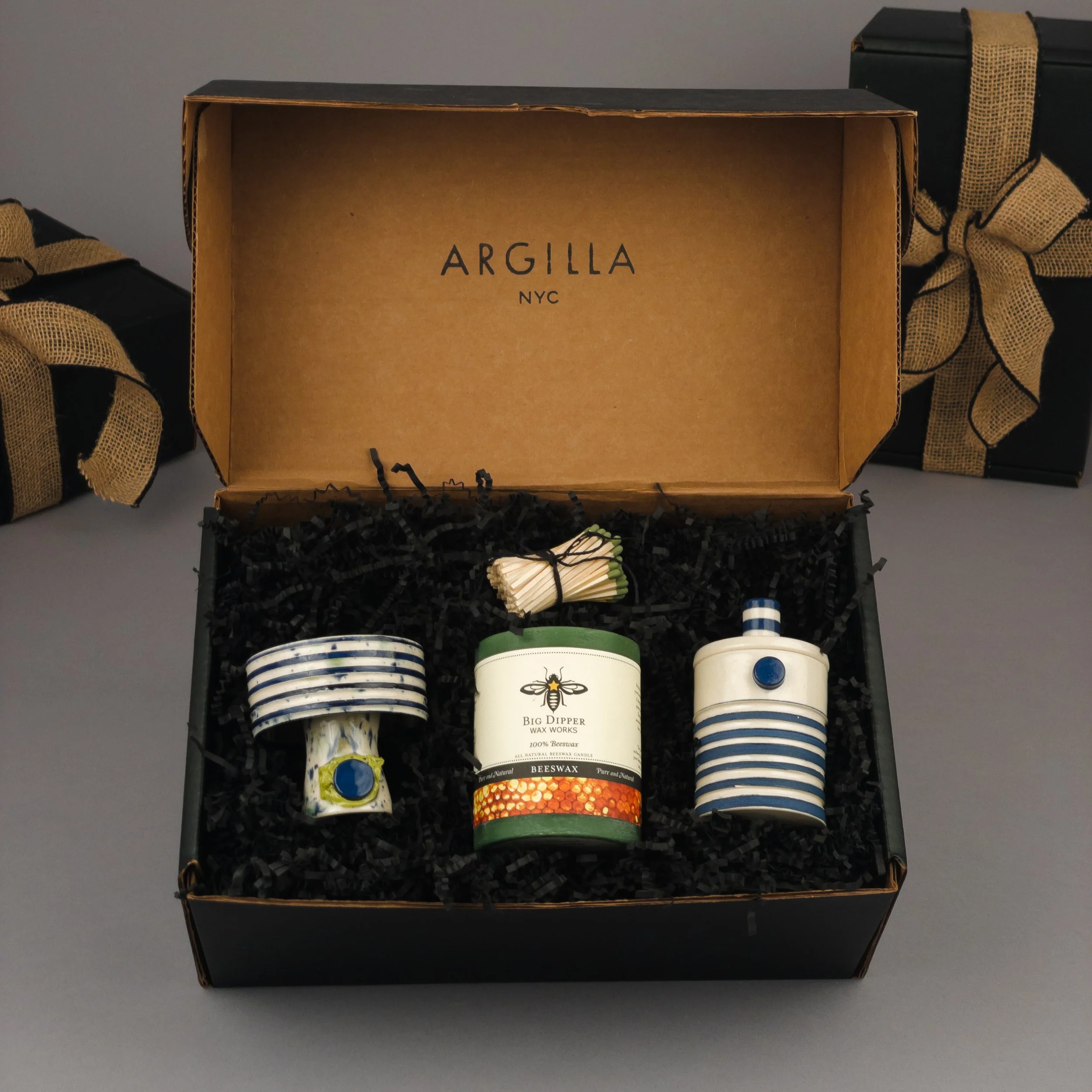 Two candle gift sets complete the collection. The first pairs a porcelain stand with a pure beeswax candle by Big Dipper Wax Works, chosen for its warm light and natural scent of honey and wax. The second adds a porcelain match striker and a small jar of color-tipped matches, creating a full ritual of light—simple gestures that turn any corner into a moment of calm.